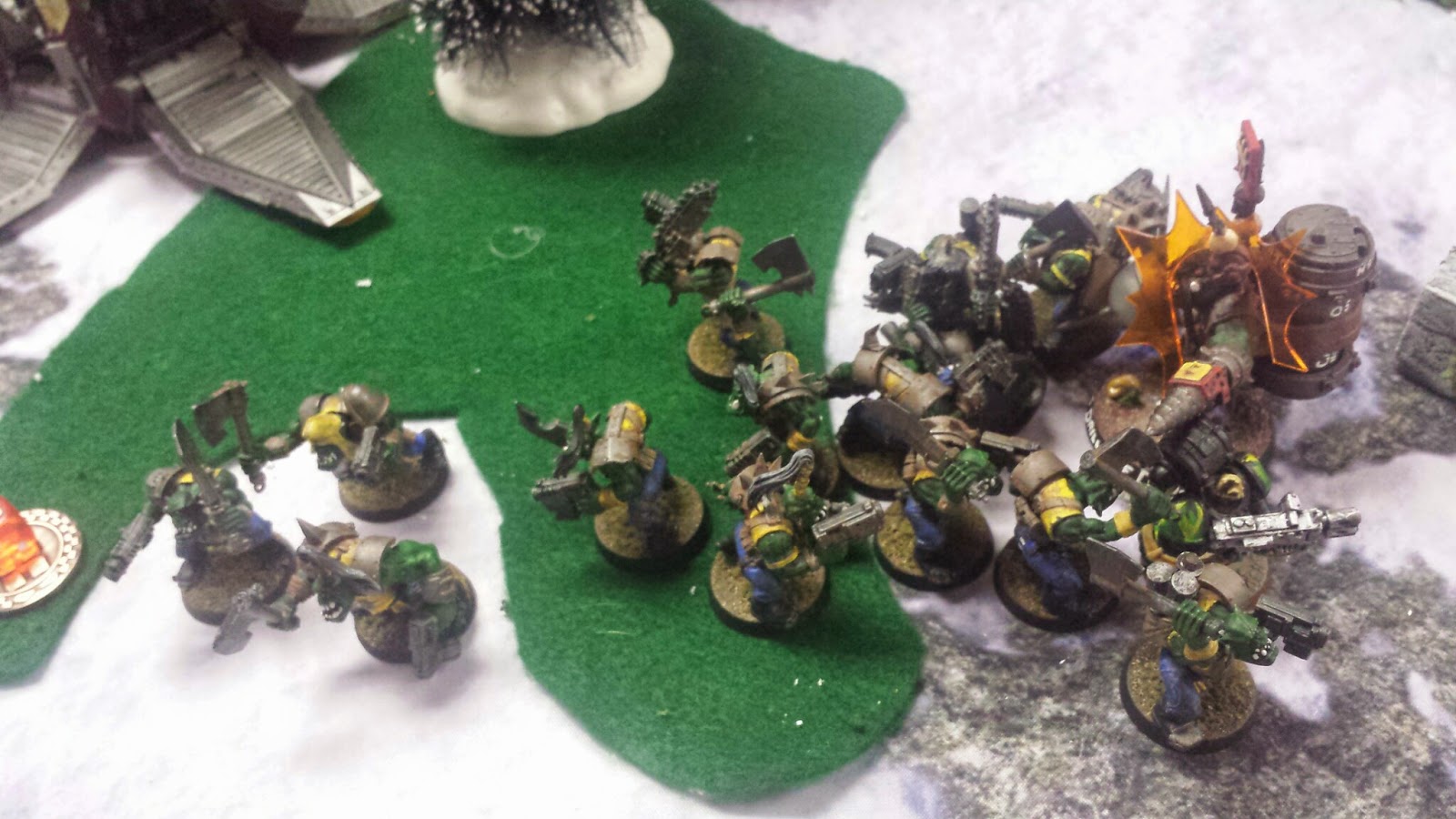 | The Dreadnought makes an amazing 11 on the dice and slams into combat followed by Big Mek Skar'ead's Boyz unit. |